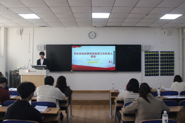 个人陈述阶段,候选人依次上台,结合 PPT 从个人经历、工作实绩、自身优势、岗位理解等方面进行阐述,并针对学生会各部门工作提出具体改进思路与未来发展规划。随后的现场答辩环节,评委结合演讲内容与实际工作场景进行深入提问,重点考察候选人的临场应变、逻辑思维与工作统筹能力。