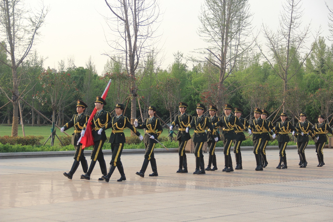晨光熹微,红旗猎猎。国旗护卫队步伐铿锵,护送国旗走向升旗台。伴着雄壮的《义勇军进行曲》,五星红旗冉冉升起、迎风飘扬,全体师生肃立注目,高唱国歌。