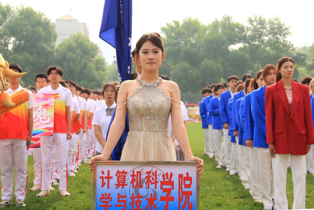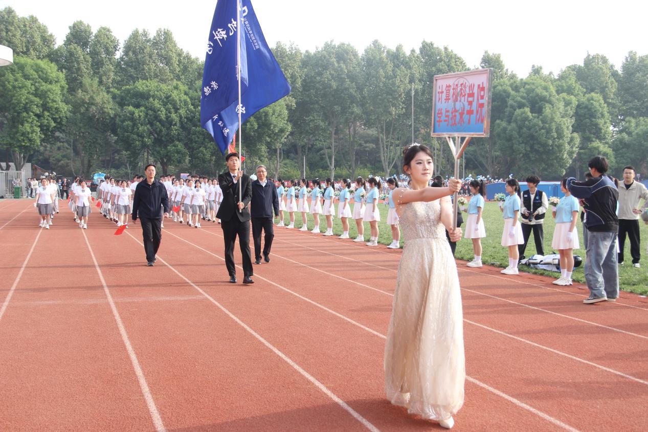 伴随着激昂的运动员进行曲,我院60余名师生组成的代表队,在旗手引领下,迈着整齐的步伐步入会场。大家身姿挺拔、精神饱满,步伐坚定有力,洋溢着青春朝气。代表队以“技术为翼,翱翔长空,计科学子,勇攀高峰”为口号,充分展现了我院师生求真务实、开拓进取的精神风貌,赢得了现场观众的热烈掌声。