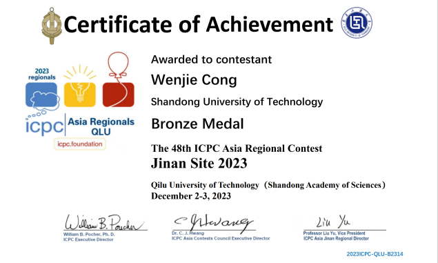 第48届国际大学生程序设计大赛亚洲区域赛(济南站)铜牌