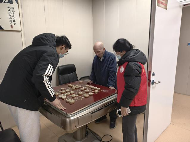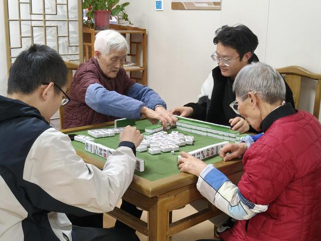 在象棋区域,志愿者与老人组成对弈小组,双方遵循象棋规则进行技艺切磋,过程中伴有与棋局相关的言语交流;在麻将区域,志愿者们加入老人现有的娱乐活动,共同参与牌局。麻将活动在既定规则下进行,期间参与者就牌局进程保持了轻松愉快地互动。